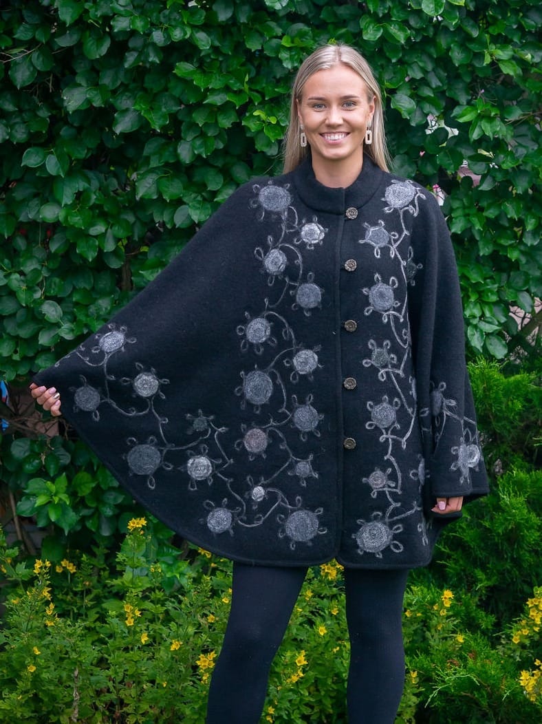 Eco-friendly, waste-free production – the details of the decorations are cut out of the production waste of other capes and installed by needle felting.