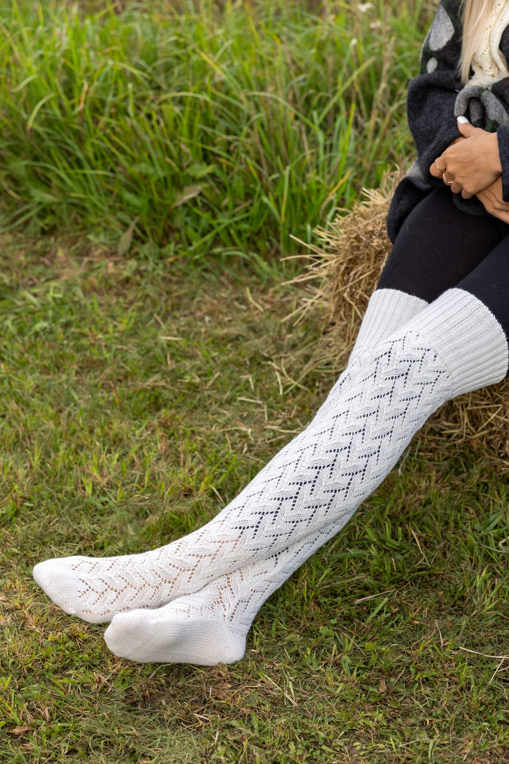 Over-the-knee knee highs in classic business fashion lace are knitted from fine woolen yarn. The ribbed upper hem ensures a snug fit and the knees don’t sag. They can also be worn as knee highs when slightly sagged.